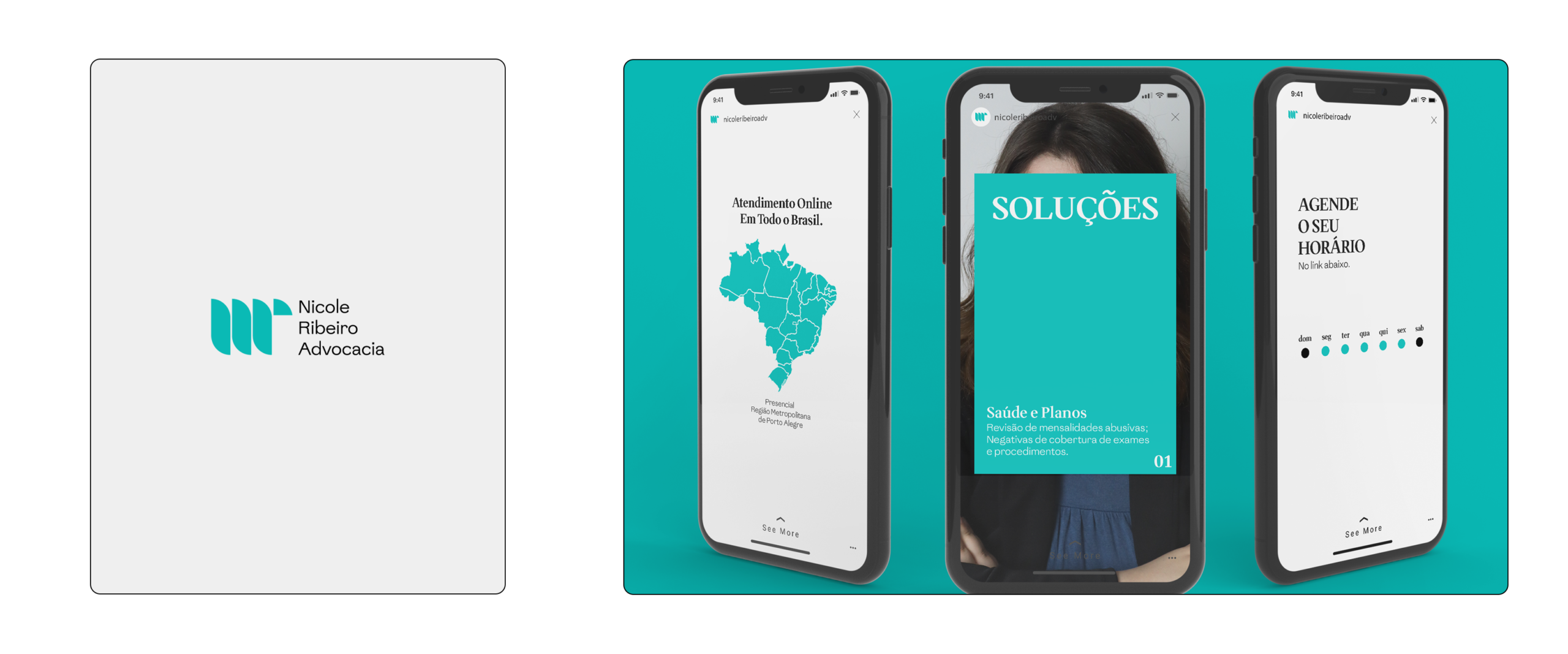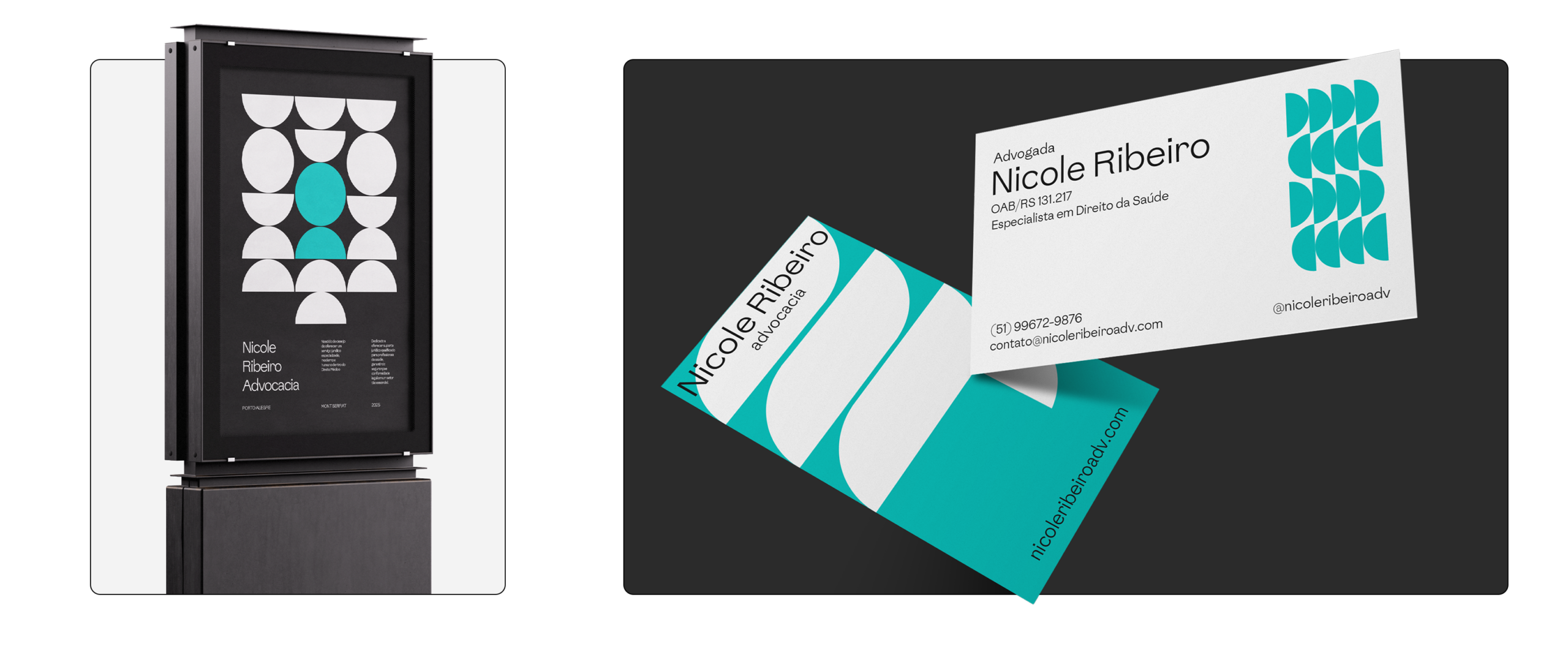 A identidade visual combina modernidade, sofisticação e empatia. A paleta de cores mescla o tom ciano — que une os significados de saúde, confiança e conhecimento — com neutros que equilibram leveza e sobriedade. Já a tipografia une tradição e contemporaneidade, com traços inspirados na tecnologia e no toque humano, refletindo o equilíbrio entre razão e sensibilidade. O resultado é uma marca sólida, elegante e acolhedora, que traduz a essência de uma advocacia feita com propósito, ética e humanidade.